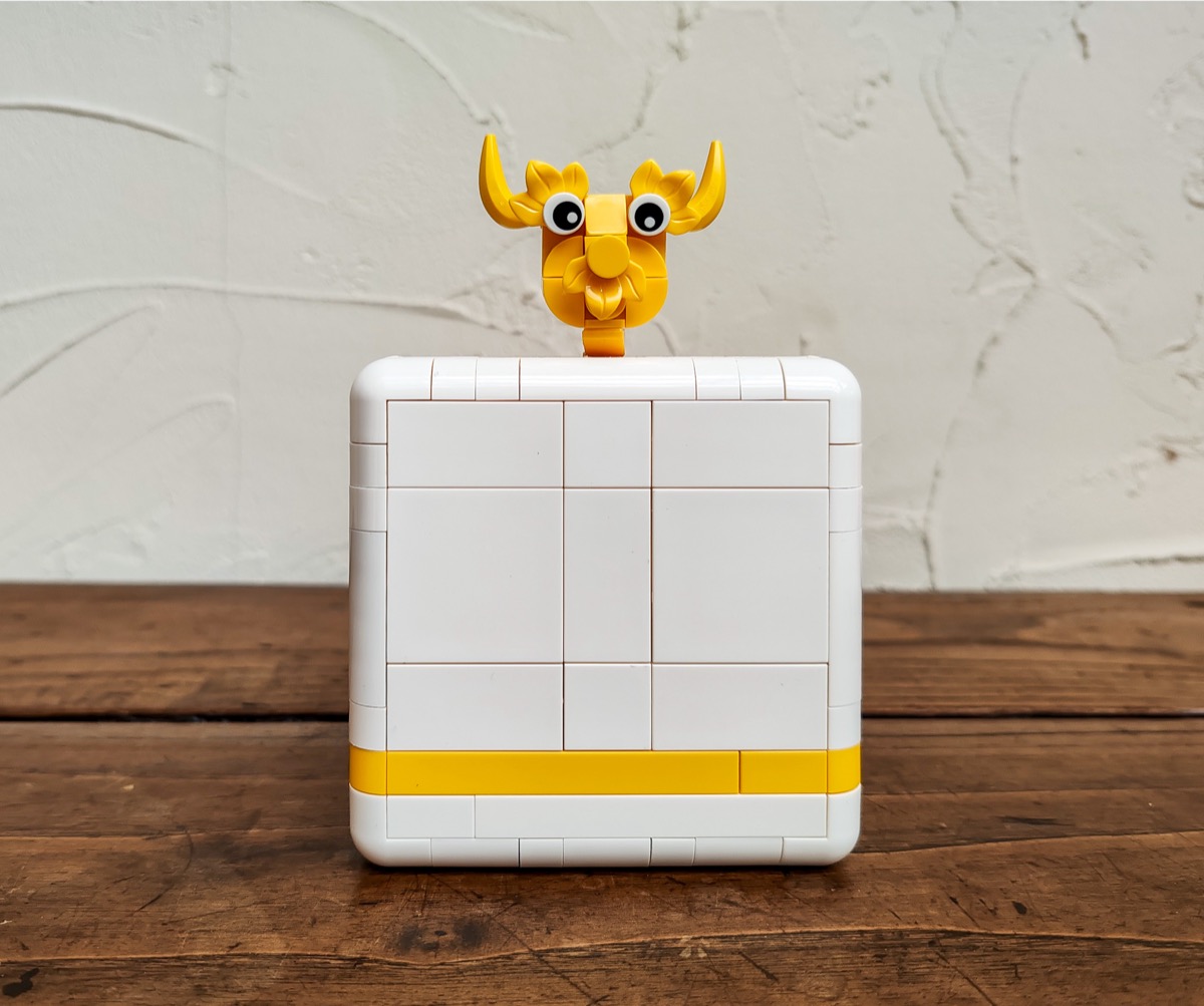 The brick machine was born from meeting Loïc Brun, LEGO Master finalist, during the exhibition of his creations at the Musée-Galerie Carnot in Villeneuve-sur-Yonne! It consists of 377 LEGO™ pieces, a specially designed electronic board, a servo motor, a speaker and, of course, a button. It can be assembled in two hours and there may still be some in stock here.