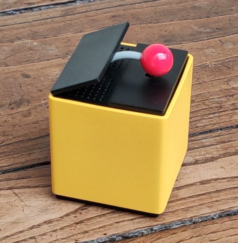 To escape the traditional box shape, I designed a first prototype with a, how to say... indefinable look. I think I had just figured out how to make revolution objects with Fusion. I painted it yellow, and the arm pink, because there was enough gray outside. You can see it all in action in this video.